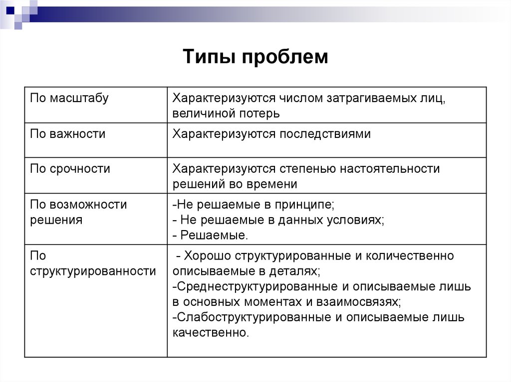 Заметим, что при определении видов перечисленных проблем вряд ли возможно допустить сколько-нибудь ощутимую ошибку, потому как любая проблема может относиться к нескольким видам одновременно. А чтобы уметь более грамотно и правильно диагностировать и анализировать проблемы, предлагаем продолжить изучение урока.