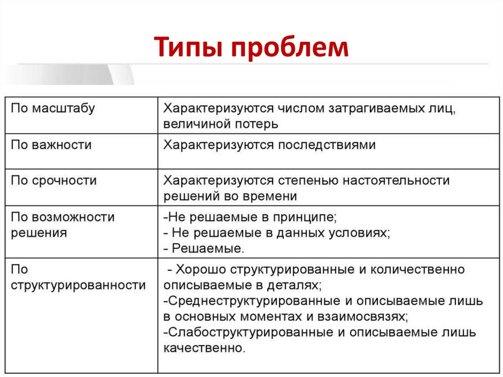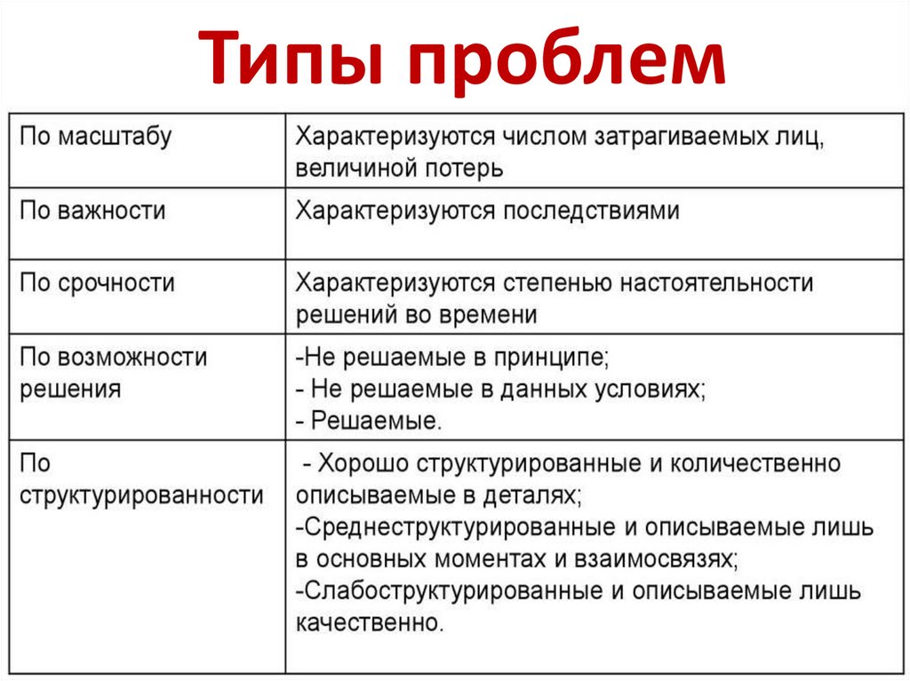 Сущность всех проблем требует от человека их анализа, оценки и составления концепции для разрешения проблемного вопроса, а также последующей проверки правильности выводов и действий опытным путем. Но о методах идентификации, диагностики и анализа проблем мы поговорим чуть позже, а пока хотим познакомить вас с их видами. Умение разбираться в типологии проблем – это первый шаг на пути к их устранению.