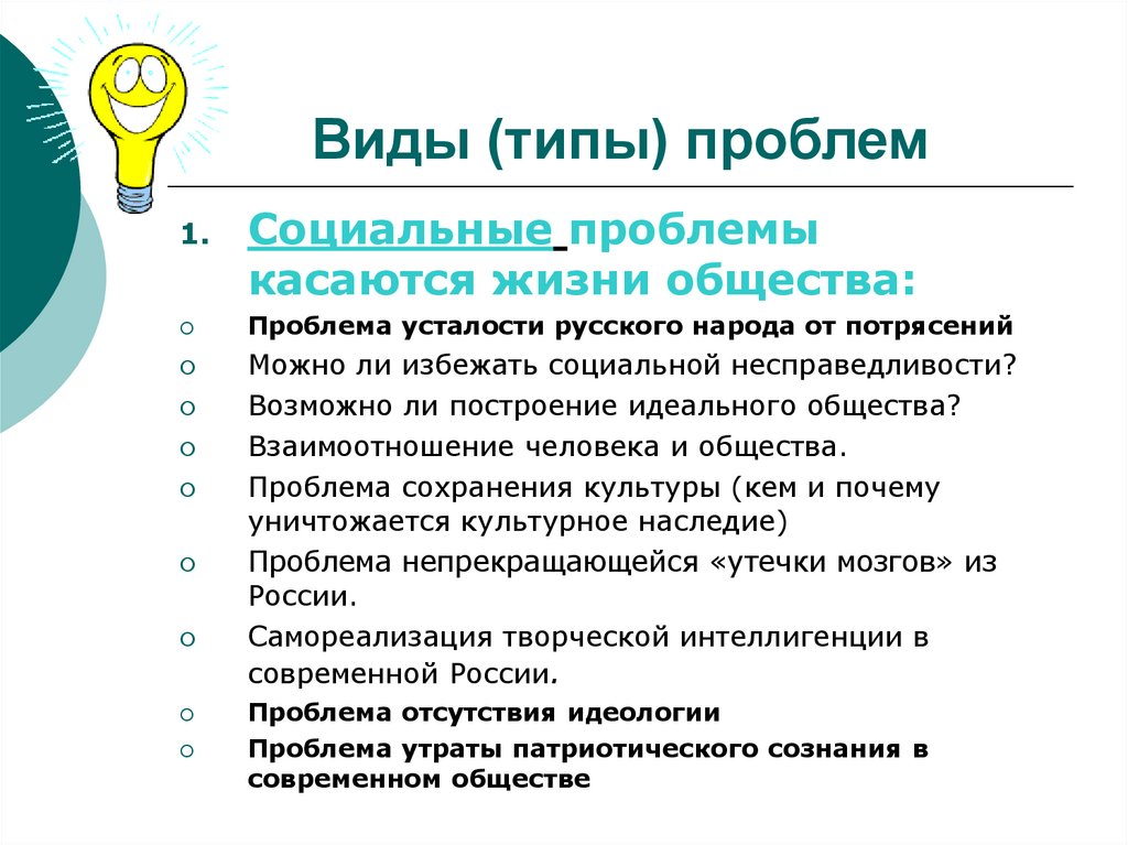 Проблемы социального характера выражаются в том, что потребности и интересы отдельных людей и групп людей удовлетворяются не полностью. К потребностям относятся как физиологические нужды (еда, жилье, одежда), так и духовные (самореализация, образование, общение). Вдаваться в подробности мы не будем, но все же стоит сказать, что социальные проблемы разделяются на семейные и индивидуально-личностные, социально-экономические, социально-экологические, поведенческие, проблемы социальной стратификации, символизации и социального моделирования и социально-политические.