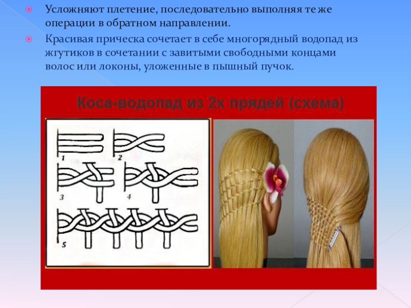 Водопад — это коса со струящимися локонами, отдельные пряди проходя сквозь плетение остаются свободно свисающими.