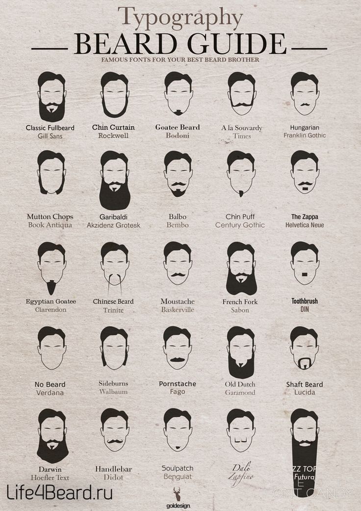 Чаще всего фасоны бороды имеют два названия — описательное, отражающее форму, и «историческое», которое обычно отражает наиболее известную личность или эпоху, связанную с такой бородой. Если не вдаваться в историю парикмахерского искусства, в наши дни так или иначе популярны следующие типы бород: