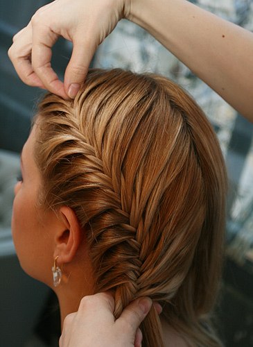 Для податливости прядей слегка смажьте муссом. - Начинайте плетение от виска: сначала стандартная коса с добавлением прядей с боковых частей шевелюры.