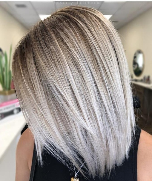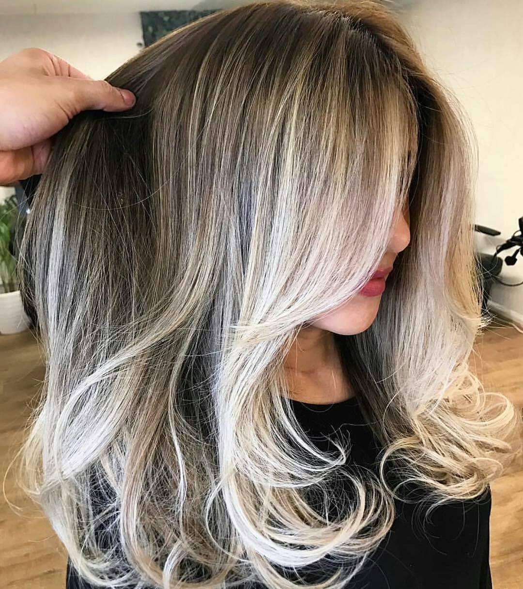 Чтобы придать потрясающий вид обычным светлым волосам, нужно добавить металлический оттенок! Темно-русые длинные волосы от корней с легким сиянием платинового на кончиках – контраст светлых и темных оттенков придаст объем вашим волосам.