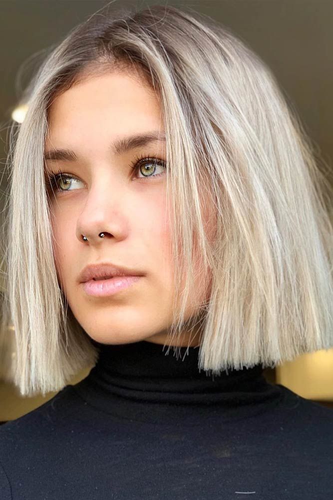 - Классическое каре блонд с челкой отлично смотрится в платиновом оттенке. Образ получает малую толику глянца, а дополнительных усилий при укладке не требуется.