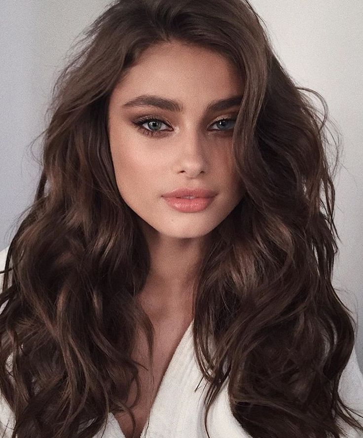 - Темный каштан хорошо смотрится на средних и длинных волосах, делает более выразительными зеленые, голубые и серые глаза. Также он подойдет обладательницам смуглой кожи. Для женщин со светлой кожей такой цвет лучше использовать в качестве частичного окрашивания (амбре, колорирование, мелирование).