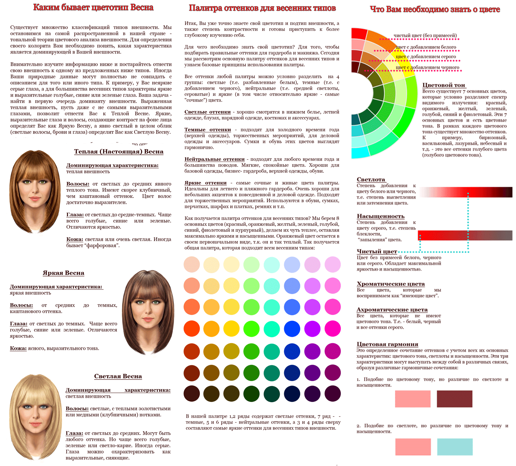 «Яркая весна» — насыщенный и привлекающий внимание цвет глаз, персиковый цвет кожи, волосы обычно светлого или светло-русого оттенка.