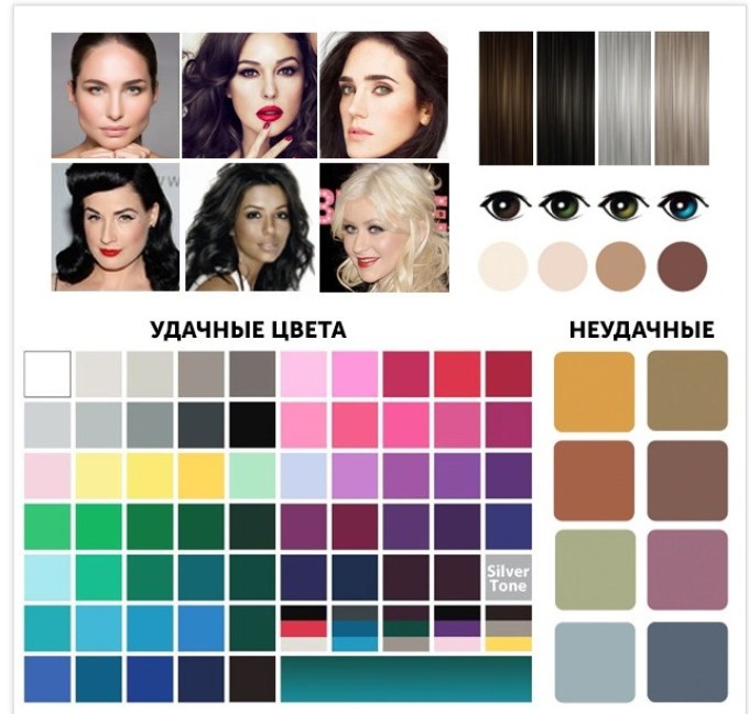 Если у вас холодные краски внешности, пепельно-русые волосы и серо-голубые, серо-зеленые или серые глаза, и яркие цвета вас подавляют, то вы найдете рекомендации по подбору цветов для холодной колористики в статье о Мягком цветотипе.