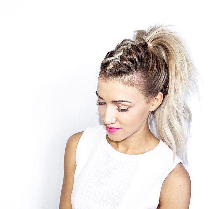 Все что нужно, это собрать волосы от лба и заплести косу до затылка, а затем собрать все волосы в хвост. Косу рекомендуем немного распушить пальцами, а сам хвост подкрутить на плойку или начесать, чтобы придать объем. Также Вы можете резинку прикрыть прядью волос.