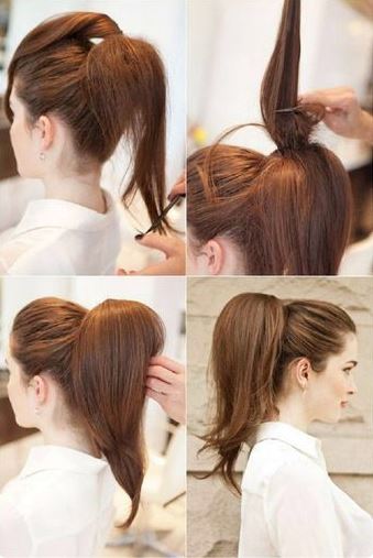 - Чтобы придать хвосту объем у основания, отделите несколько прядей сверху и начешите. Сбрызните лаком для волос.