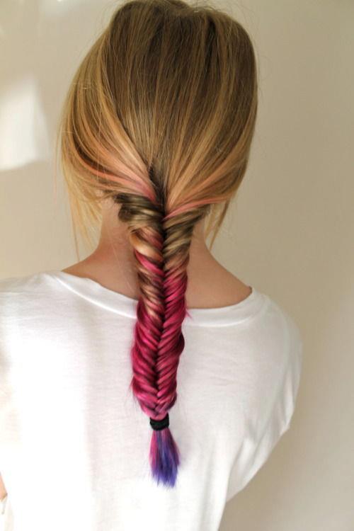 - Колорированные и мелированные. Особенно красиво смотрятся тонкие контрастные прядки в общей массе заплетенных волос. Даже если у вас нет окрашивания, не беда: можно воспользоваться мелками для кратковременного окрашивания.