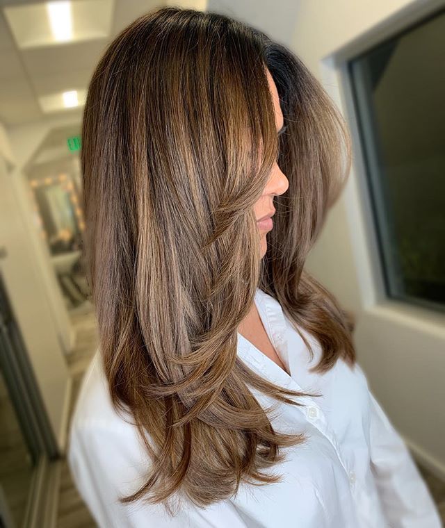 12. Длинные многослойные волосы старше 50 лет с обратным омбре. На этом изображении показано, что расположение слоев имеет решающее значение для многослойных причесок для 50-летней женщины с длинными волосами, поскольку это может создать эффект отскока в нужном месте.