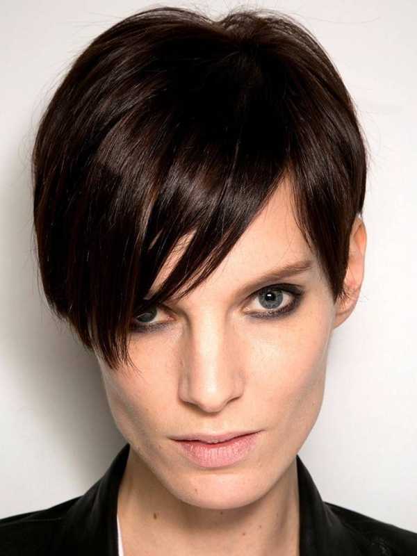 Стилисты сегодня предлагают короткую асимметричную гладкую прическу с неровными прядями. Такая стрижка корректирует пропорции слишком узкого лица.