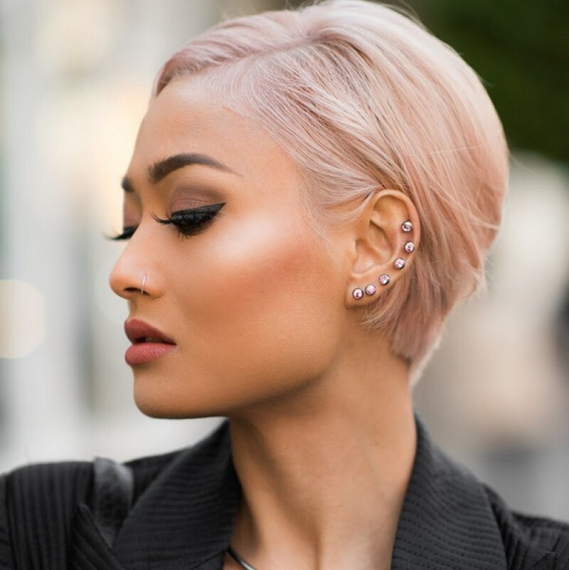 Легкая щетина в височной части выглядит весьма дерзко у девушек. Выбритые виски можно сочетать как с удлиненным бобом, так и с каскадом, тогда волосы можно зачесывать на одну сторону, чтобы демонстрировать всем свой висок. Для более раскрепощенных натур можно украсить выбритые виски рисунками.