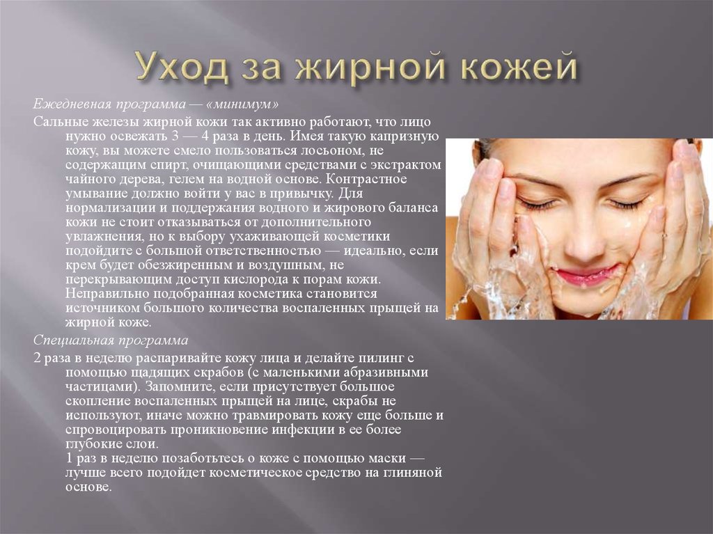 ΠΠΈΡΠ½Π°Ρ ΠΊΠΎΠΆΠ° Ρ Π°ΡΠ°ΠΊΡΠ΅ΡΠΈΠ·ΡΠ΅ΡΡΡ ΡΠ°ΡΡΠΈΡΠ΅Π½ΠΈΠ΅ΠΌ ΠΏΠΎΡ, ΠΏΠΎΡΠ²Π»Π΅Π½ΠΈΠ΅ΠΌ ΡΠ΅ΡΠ½ΡΡ ΡΠΎΡΠ΅ΠΊ, Π±Π»Π΅ΡΠΊΠ°, ΡΡΡΠΊΠ»ΠΎΠ³ΠΎ, Β«Π·Π΅ΠΌΠ»ΠΈΡΡΠΎΠ³ΠΎΒ» ΡΠ²Π΅ΡΠ° Π»ΠΈΡΠ°, Π±ΡΡΡΡΡΠΌ Π·Π°Π³ΡΡΠ·Π½Π΅Π½ΠΈΠ΅ΠΌ ΠΊΠΎΠΆΠΈ Π³ΠΎΠ»ΠΎΠ²Ρ, ΠΈΠ·-Π·Π° ΡΠ΅Π³ΠΎ ΠΏΡΠΈΡ ΠΎΠ΄ΠΈΡΡΡ ΠΌΡΡΡ Π²ΠΎΠ»ΠΎΡΡ ΠΊΠ°ΠΆΠ΄ΡΠΉ Π΄Π΅Π½Ρ. ΠΡΠ»ΠΈ Π²Π°Ρ Π±Π΅ΡΠΏΠΎΠΊΠΎΡΡ ΠΏΠ΅ΡΠ΅ΡΠΈΡΠ»Π΅Π½Π½ΡΠ΅ ΡΠΈΠΌΠΏΡΠΎΠΌΡ, ΠΎΠ±ΡΠ°ΡΠΈΡΠ΅ΡΡ Π·Π° ΠΊΠΎΠ½ΡΡΠ»ΡΡΠ°ΡΠΈΠ΅ΠΉ ΠΊ ΠΊΠΎΡΠΌΠ΅ΡΠΎΠ»ΠΎΠ³Ρ.
