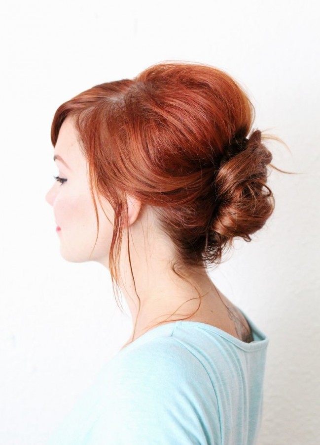 Кончики прядей надо немного начесать. И затем вся часто подворачивается в валик и фиксируется на затылке с помощью шпилек.