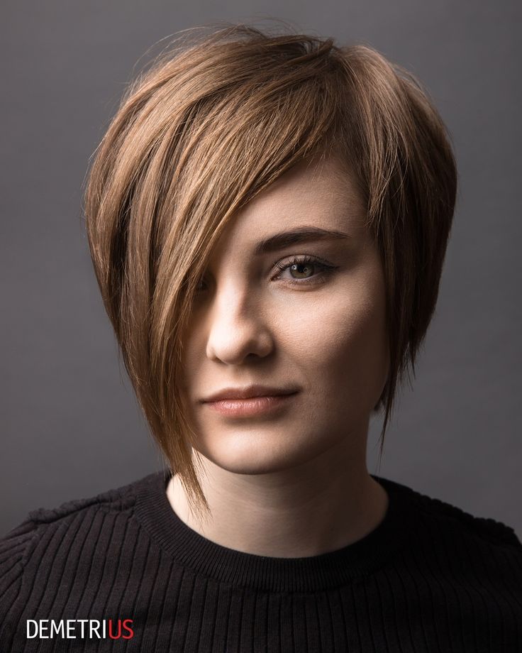 Короткая объемная асимметричная стрижка с длинной, уложенной набок, челкой поможет каждой женщине стать более элегантной и женственной.