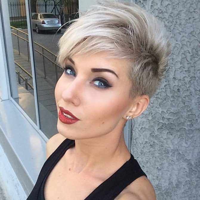 Необычная и креативная прическа Пикси с асимметричной челкой Асимметрия с выбритым вискомДля обладательниц короткой шевелюры асимметричные стрижки будут создавать наиболее эпатажные и креативные образы.