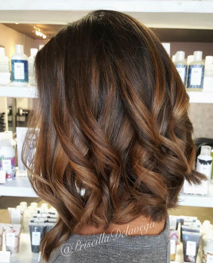 Мягкое сияние на волосах создает эффект отражения солнышка. Такая техника для темных волос средней длины считается самым натуральным вариантом.
