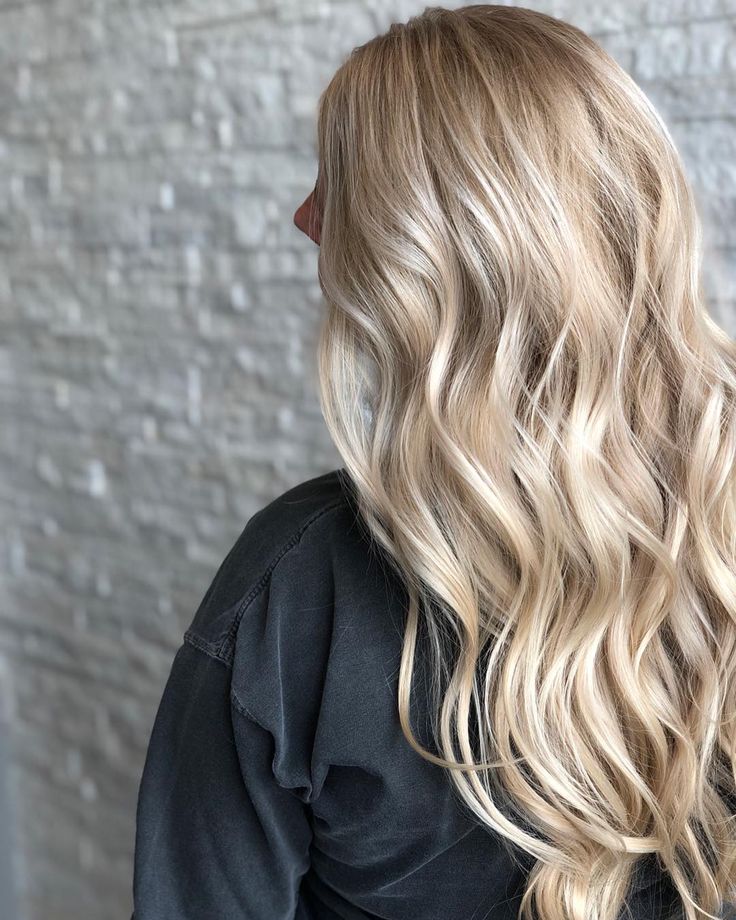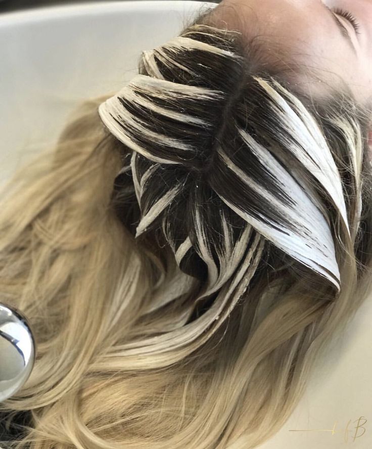 В этом захватывающем дух балаяже столько всего происходит, что я даже не знаю, с чего начать. № Во-первых, холодный блонд с выметанием, который создает великолепный контраст с теплым оттенком светлой блондинки. Затем следует корень темной тени, который придает глубину всему образу. Наконец, весь образ получил большое измерение с темными бэбилайтами, разбросанными по ее волосам.