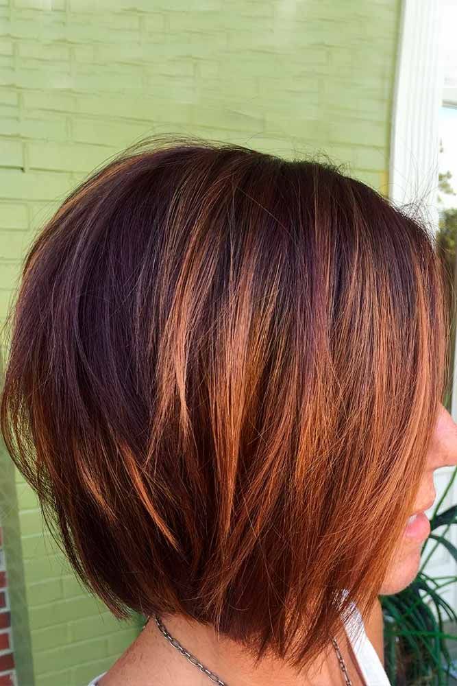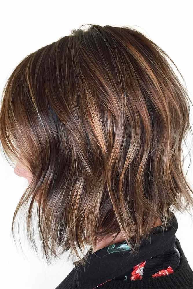 Нам очень понравилась эта прическа балаяж на коротких волосах, которая выглядит женственно, но дерзко. Текстурированная стрижка демонстрирует вариацию шоколадно-коричневого балаяжа, в то время как челка безупречно обрамляет круглое лицо в области подбородка.
