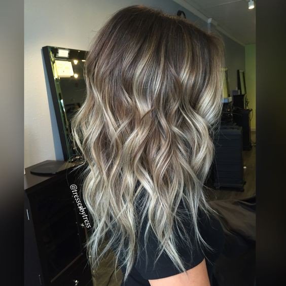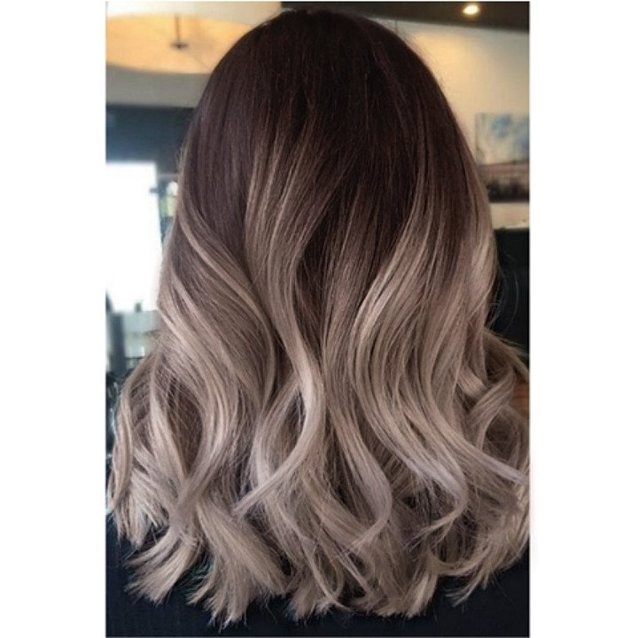 Еще одна модная опция для темно-русых волос. Имейте в виду, что при окрашивании в пепельный блонд контраст между корнями и кончиками будет сильнее, а значит, и к границам перехода цветов нужно подходить более скрупулезно.
