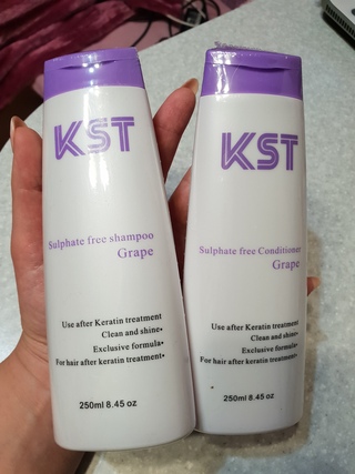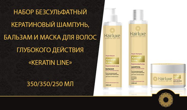 - Один набор содержит шампунь без сульфатов и кондиционер для волос, обработанных кератином.