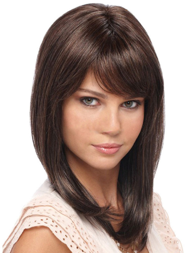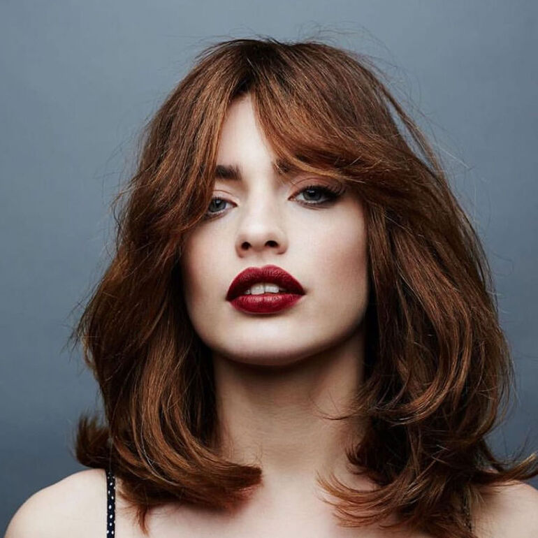 Это отличный пример прямой многослойной прически с челкой для волос средней длины. Идеальный стиль, чтобы попробовать и гламурить свой образ.