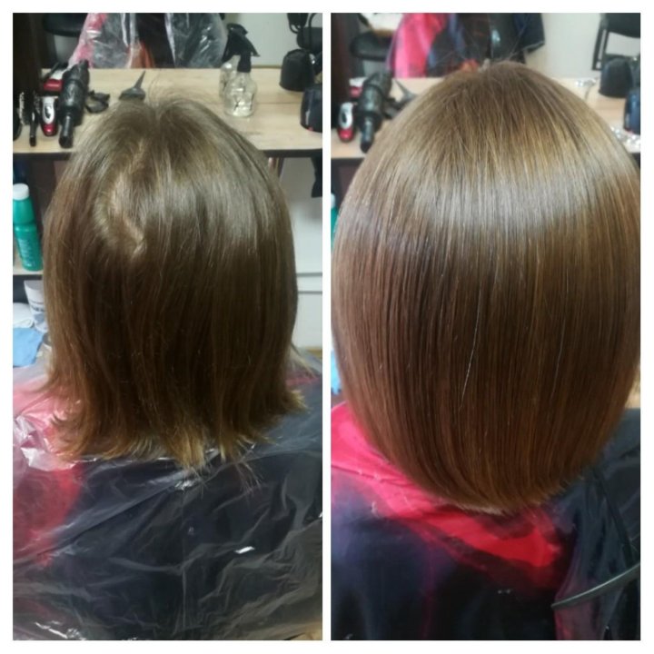 Эта процедура наполняет волосы комбинацией коллагена и кератина и рекомендуется тем, у кого вьющиеся, сухие и непослушные волосы.