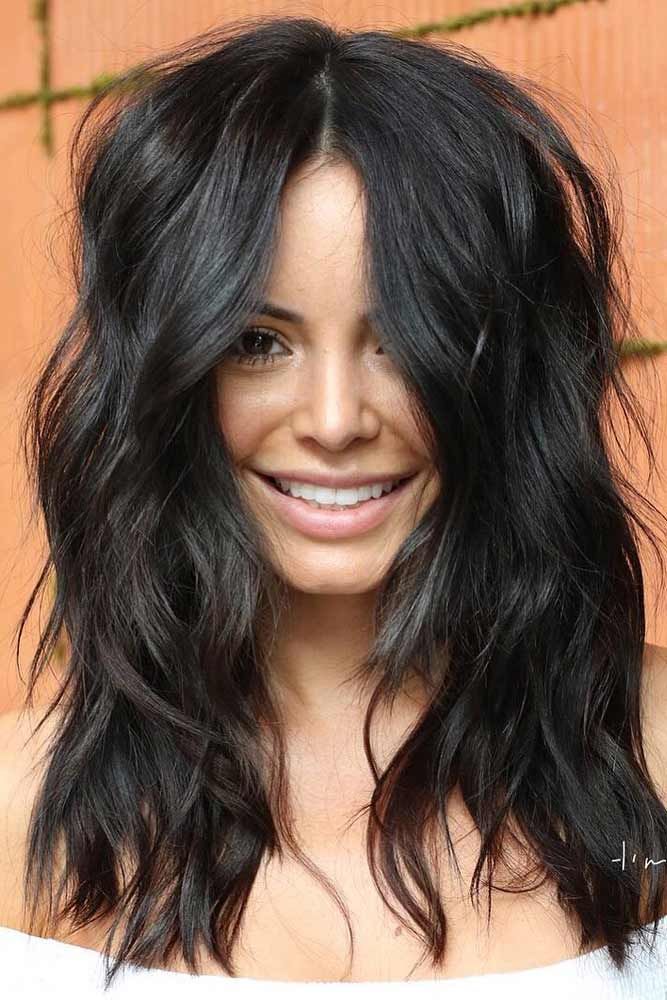 Длинные слои отлично подходят для придания объема густым волосам. Эти красивые локоны красиво сияют благодаря добавленной форме и насыщенному темно-красному цвету. Для овального лица сконцентрируйте слои вокруг лица.
