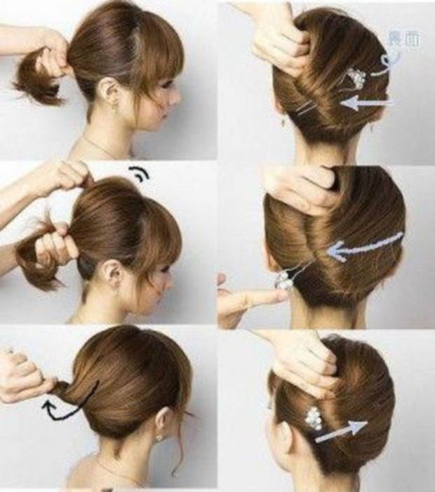 Закрепите укладку шпильками. - Если есть челка, уложите ее, заворачивая внутрь.