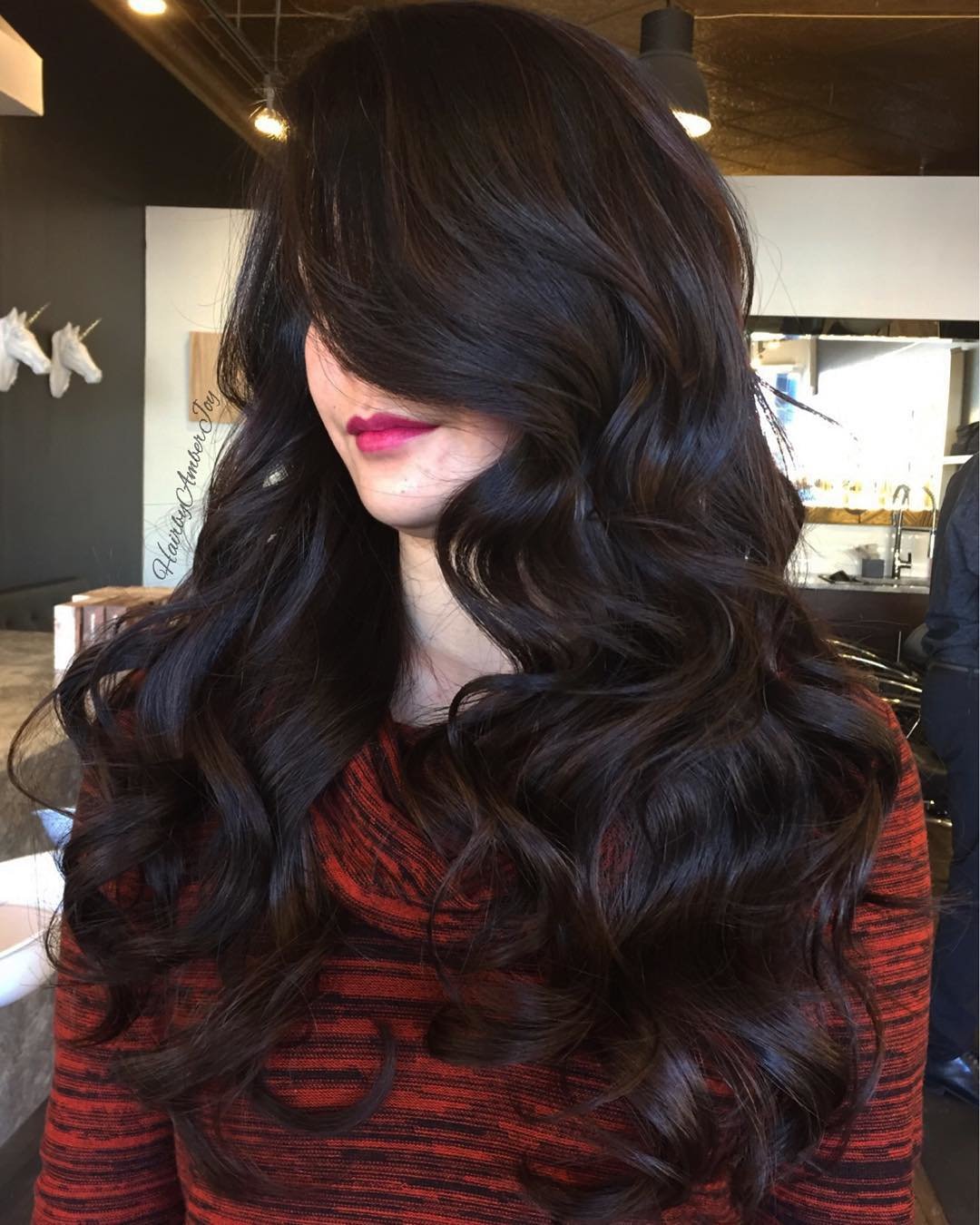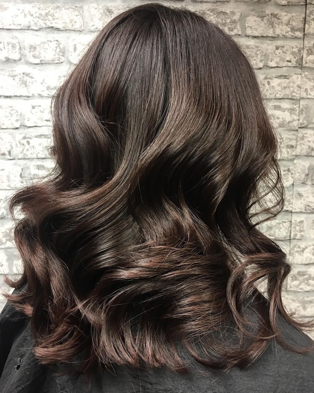 Этот каштановый оттенок выглядит декадентским на длинных волнах Олдриджа. Обратите внимание, как ее тон постепенно становится прохладнее от верхнего слоя к нижнему.