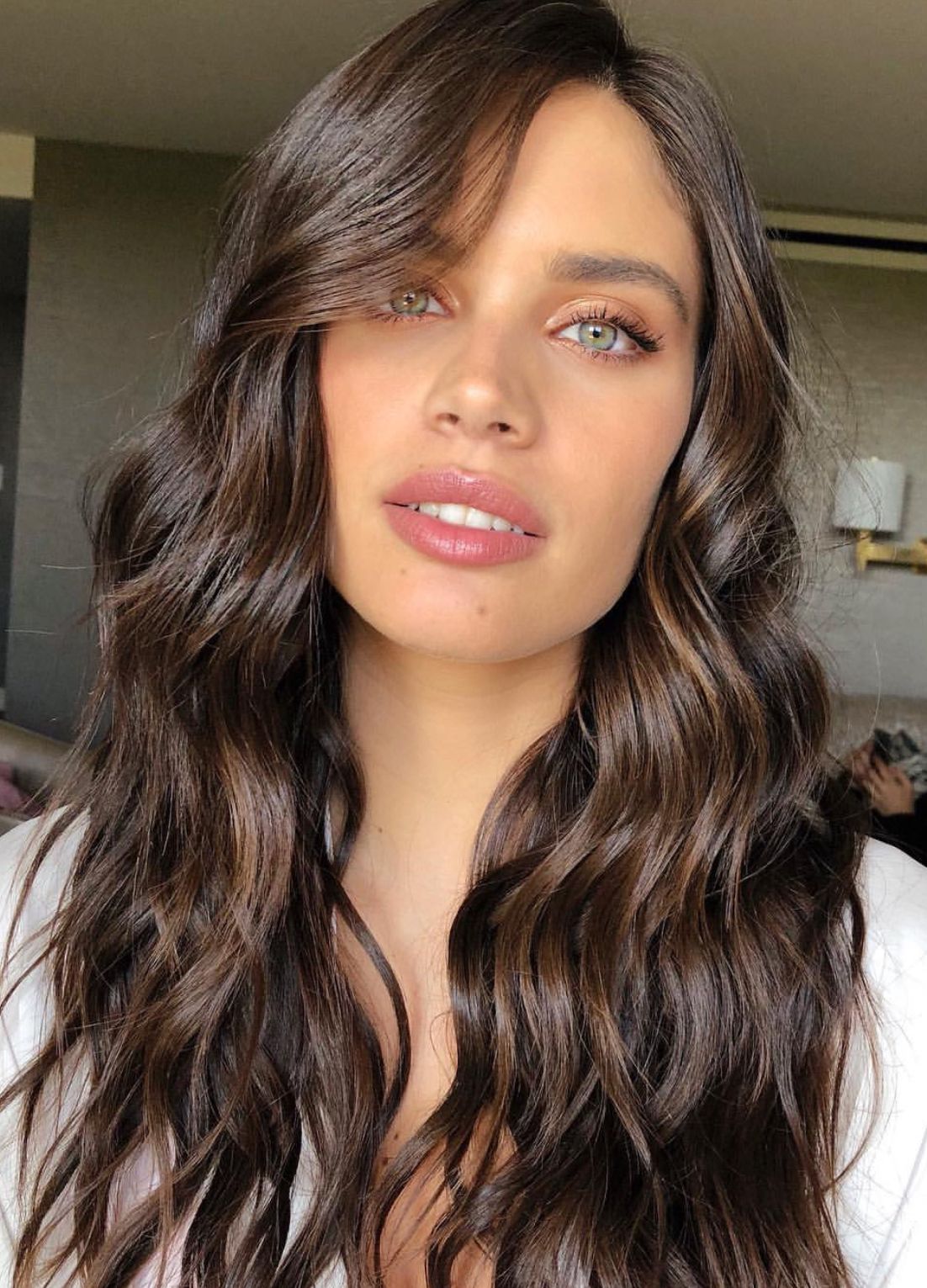 Модель Кайя Гербер носит гладкий каштановый цвет волос.