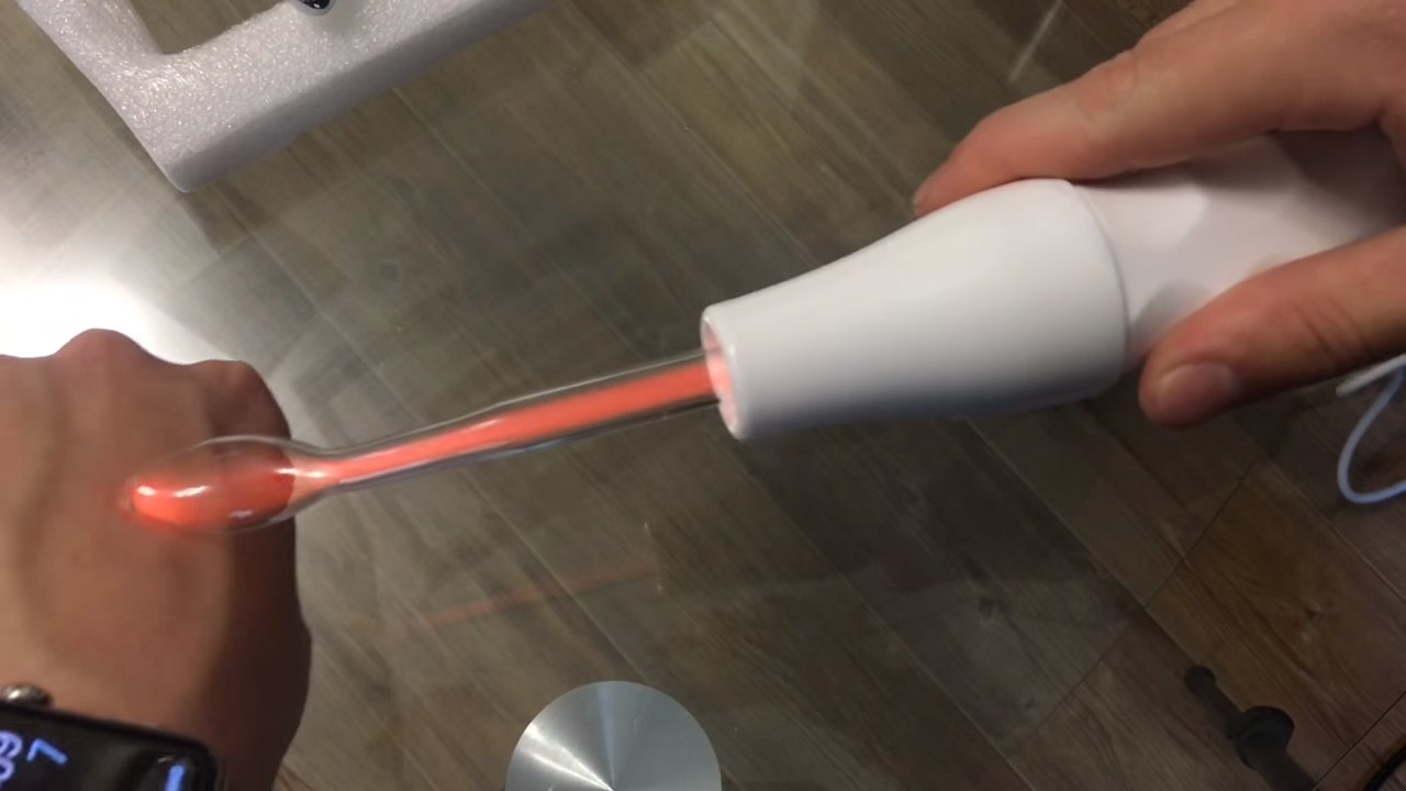 Разряд проходит через специальный стеклянный электрод, заполненный инертным газом. Частота тока от 110 до 400кГц, напряжение тока до 20кВатт, сила тока от 100 до 200 мА.