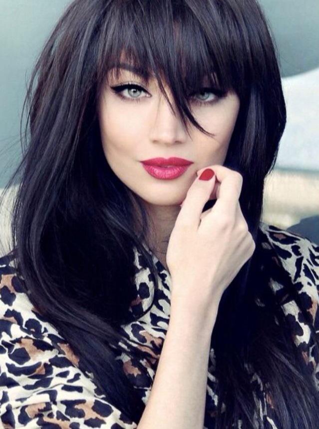 Еще одна прическа с челкой, но очень густая прямая челка, которая заканчивается прямо над бровями и переходит в длинные прямые волосы, изящно ниспадающие на оба плеча.