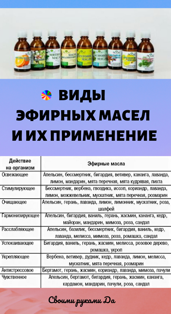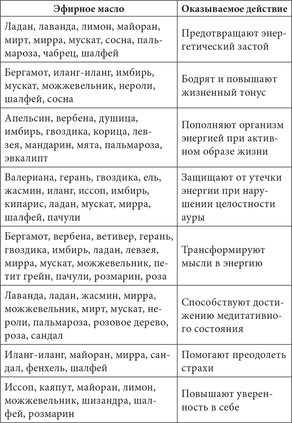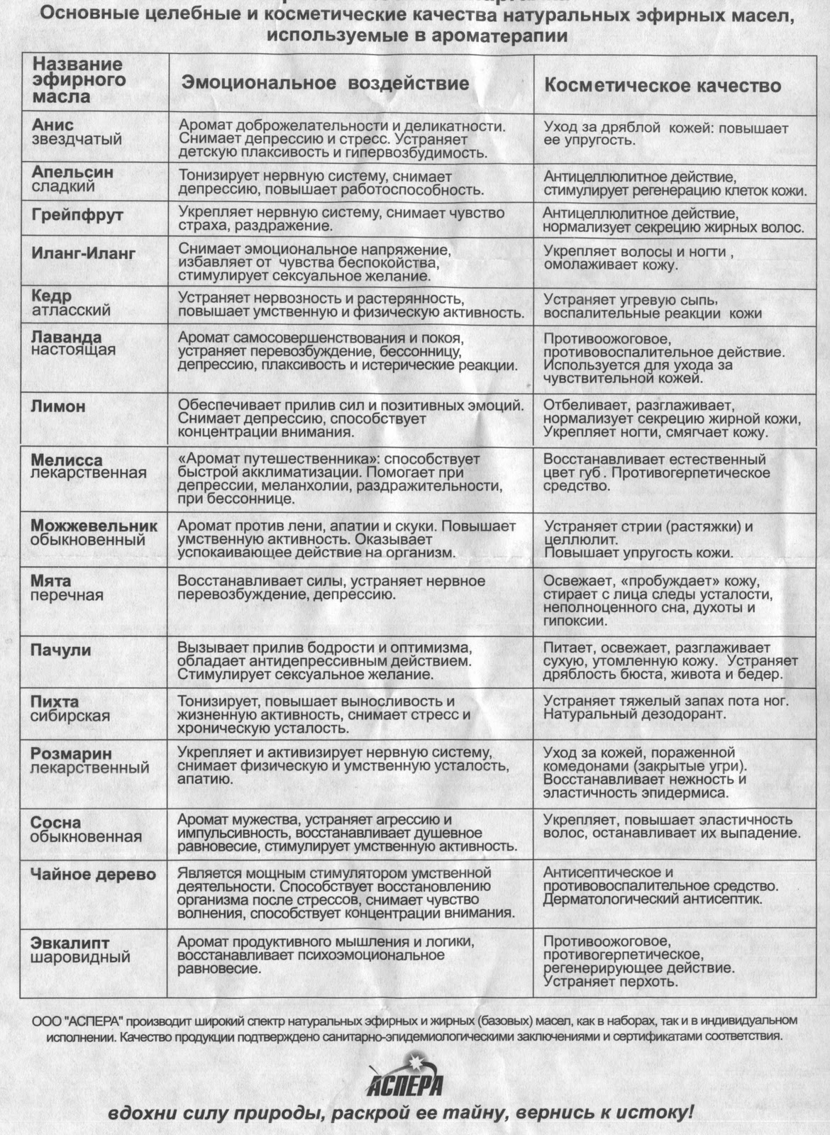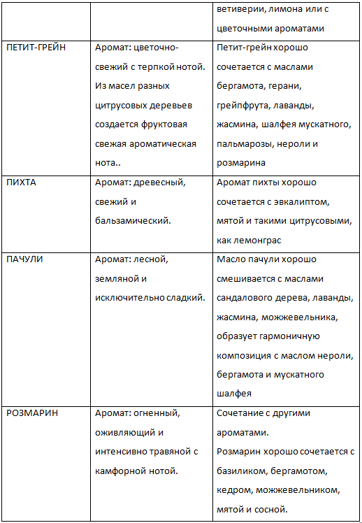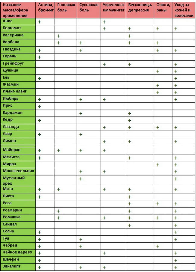 Масла: аир, бей, вербена, гвоздика, ель, иланг-иланг, кедр, кипарис, кориандр, лаванда, ладан, лимон, мирра, мускатный орех, мята, нероли, пачули, петтигрейн, розмарин, розовое дерево, ромашка, сандал, сосна, чайное дерево, шалфей, эвкалипт.