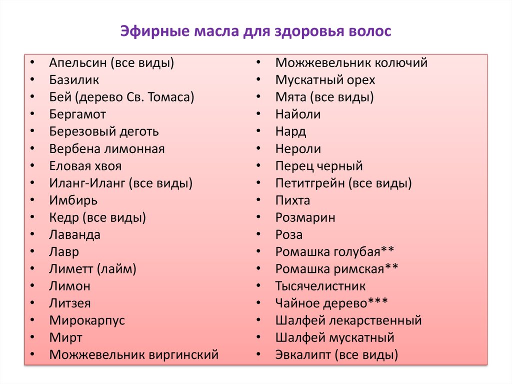 Ниже приведен список эфирных масел, которые могут решить различные проблемы с волосами и способствовать здоровому росту.