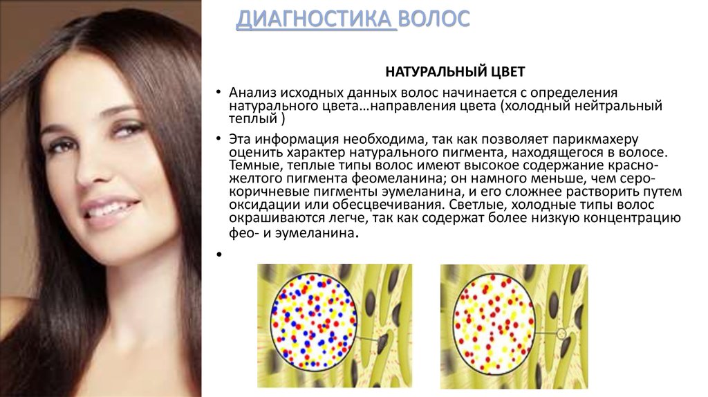 Полностью натуральный цвет волос может быть классифицирован как каштановый, светлый, черный, рыжий или белый. Серые и светло-русые цвета волос имеют все оттенки коричневого. Эумеланин встречается в виде небольших сферических гранул, имеющих цвет от коричнево-красного до черного. Существует два различных типа эумеланина: черный и коричневый. Как правило, чем больше эумеланина присутствует, тем темнее цвет волос, чем меньше эумеланина, тем светлее волосы (2).