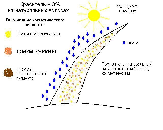 Меланины осветляются любым окислительным красителем, окислитель перекись водорода (h302) необходим не только для создания цвета, но и для устранения влияния естественного цвета волос, в противном случае цвета будут темными. Чем выше концентрация h302, тем больше эффект осветления натурального меланина.