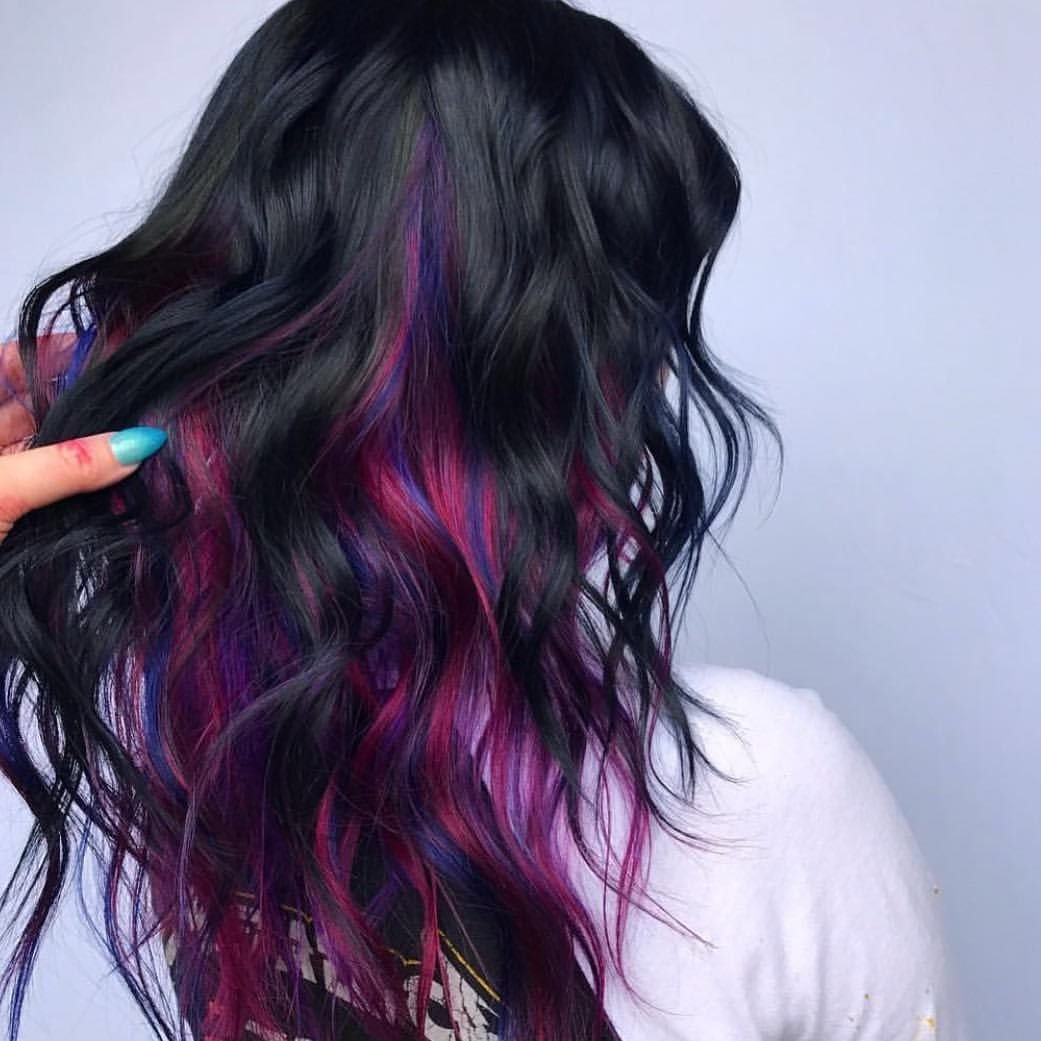 Вы можете использовать свои черные волосы в качестве основы цвета, а затем нанести два оттенка фиолетового, добавив синий или зеленый цвета. Всегда хорошо сочетать два ярких цвета и два пастельных, но выбор остается за вами.