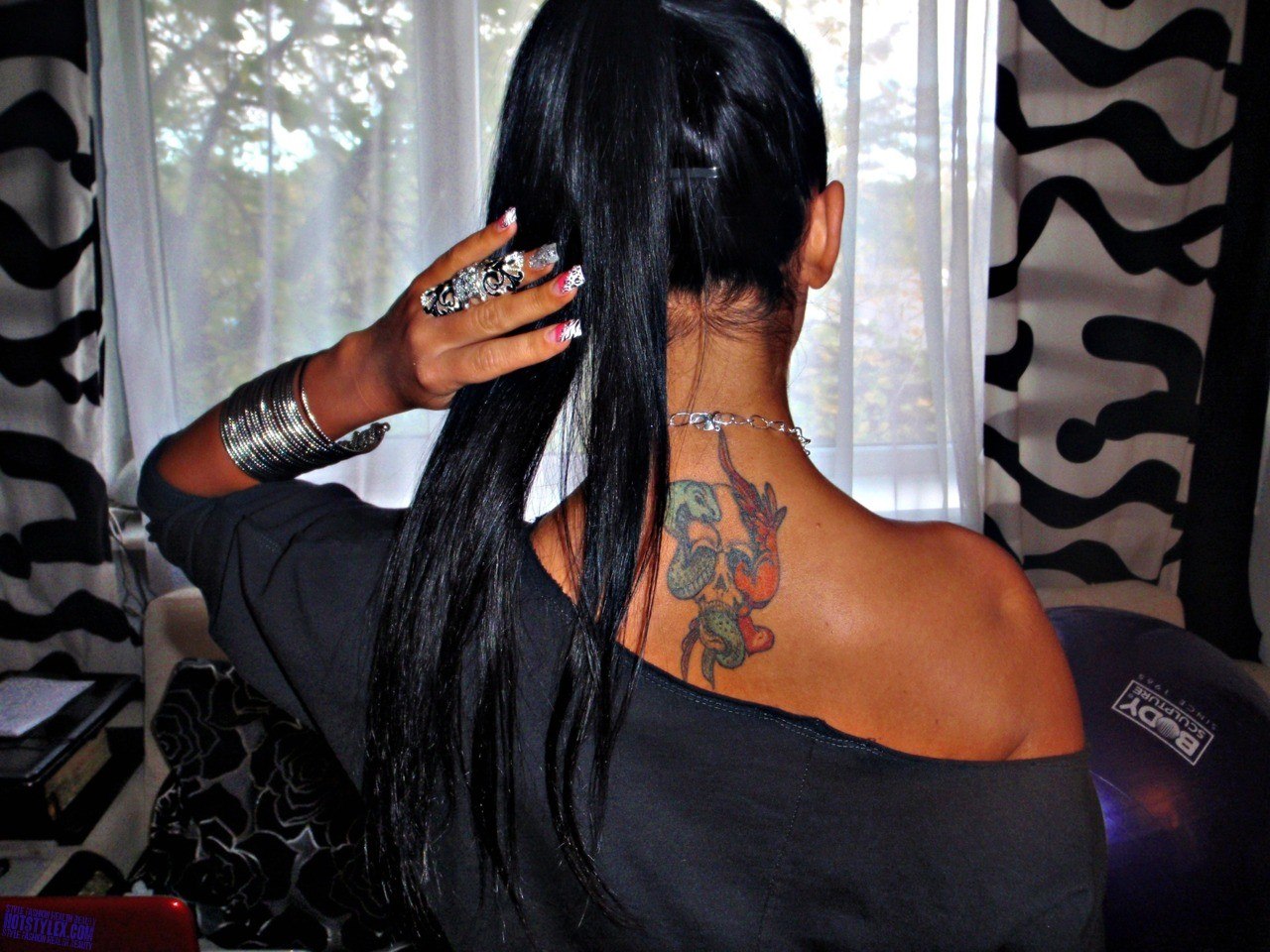 Фото длинноволосой девчонки в кожаной куртке со спины.