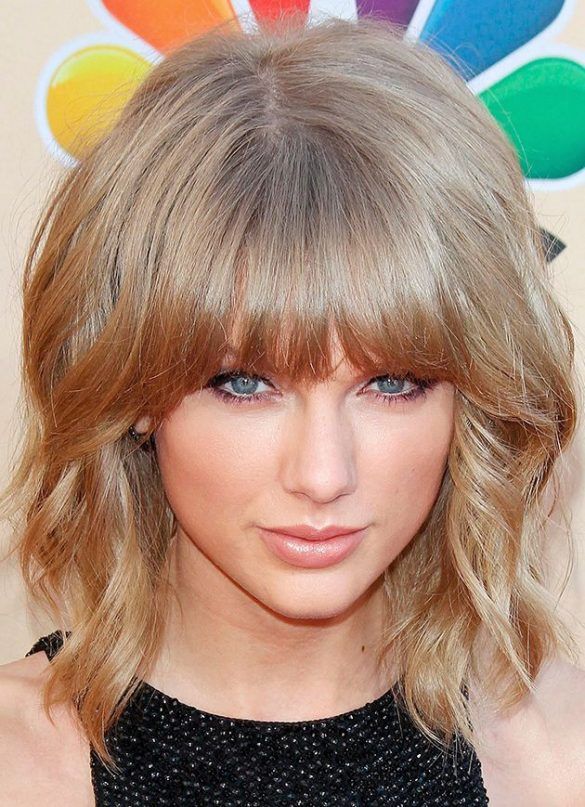 В последнее время Тейлор Свифт раскачивает свои локоны короткой челкой. Стиль ретро 80-х выглядит свежо с ее легкими слоями.