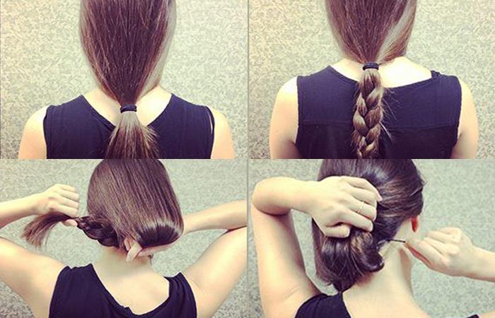 - Затем соберите ваши волосы внизу резинкой и подверните их под низ. Зафиксируйте волосы на затылке под волосами, чтоб ничего нигде не было видно.