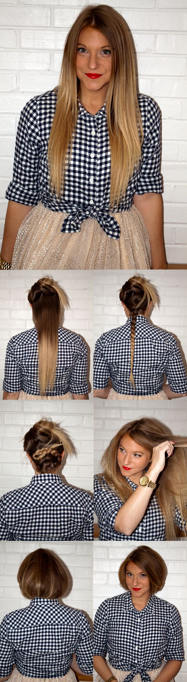 Наверное любая девушка и женщина обладательница длинных волос втайне всегда мечтает примерить на себя короткую стрижку, но вот осмелиться хотя бы на ту же стрижку каре или боб не может, и сегодня для Вас дорогие дамы наш сайт сделал подборку уроков с фото как может выглядеть короткая прическа из длинных волос на один день.