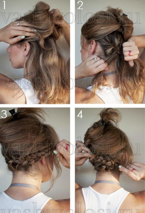 - В общем все делается, как и в предыдущих уроках. Верхняя часть волос собирается, а нижние волосы заплетаются в косичку и хорошо фиксируются на затылке под волосами.