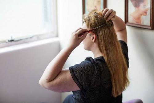При необходимости снова сбрызните волосы водой, чтобы они были красивыми и влажными. Очень важно следить за тем, чтобы ваша девушка держала голову прямо, не наклоняется. Вы захотите периодически проверять это во время стрижки! Пусть она найдет пятно на стене прямо перед собой и пристально смотрите на нее.