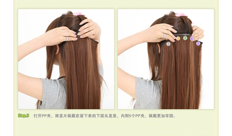 В качестве крепления для локонов используются маленькие заколки-крабики или клипсы. Принцип закрепления прядей в нужном месте довольно прост. При помощи таких накладных волос на заколках можно легко увеличить длину волос или же прибавить им недостающего объема. Заколочки фиксируются на родных волосах в прикорневой области, после чего прикрываются своими волосами так, что их потом совсем невидно.
