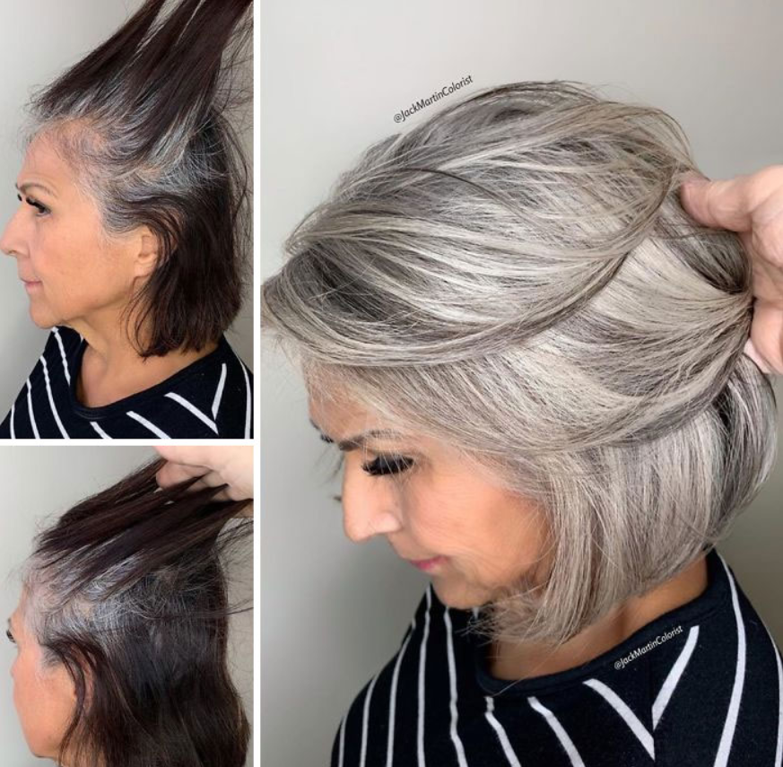 «Это будет двойная обработка, которая означает, что вы закрашиваете или смешиваете седые волосы, а затем добавляете акцент, который может быть ярким или слабым. На самом деле это довольно легко для блондинок. Дома вы «размазываете» корни, чтобы покрыть седые волосы, используя перманентную краску, чтобы покрыть корни, но вы должны защитить блики или балаяж на концах. В салоне я обычно наношу маску на кончики волос, чтобы создать некий барьер, чтобы, когда вы смываете перманентную краску с корней, она не тускнела на концах. Это можно легко сделать дома с помощью интенсивной маски для волос, или вы можете нанести что-то вроде моего Shade Shot Gloss, чтобы одновременно усилить или тонизировать цвет на концах».