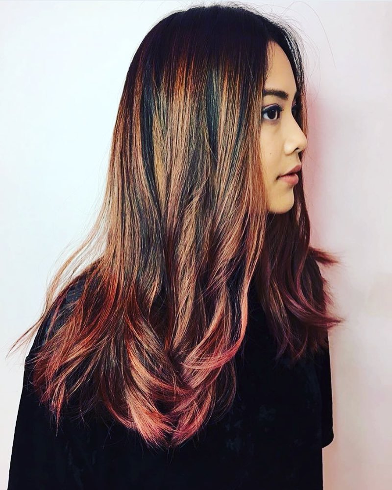 Выбирая оттенок рыжего для кончиков, следует учитывать исходный цвет волос. Рыжие кончики прекрасно сочетаются с общим темным тоном шевелюры.