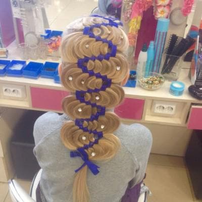 - Развязать хвост из верхних волос и накрутить их идентично предыдущим прядям.