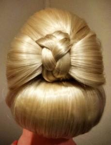 Полученные ушки — петельки следует распределить равномерно, придавая форму банта. Сзади закрепляем шпильками. Уже получается что-то напоминающее конечный результат.